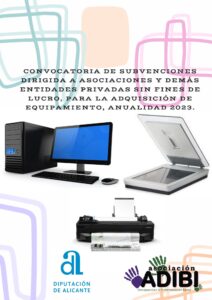 Adibi recibe 1.400 €, para la adquisición de un ordenador, impresora y escáner gracias a Diputación de Alicante en su Convocatoria de Subvenciones dirigida a Asociaciones y demás Entidades privadas sin fines de lucro, que actúan en el ámbito del Bienestar Social en la provincia de Alicante, para la adquisición de equipamiento, anualidad 2.023.