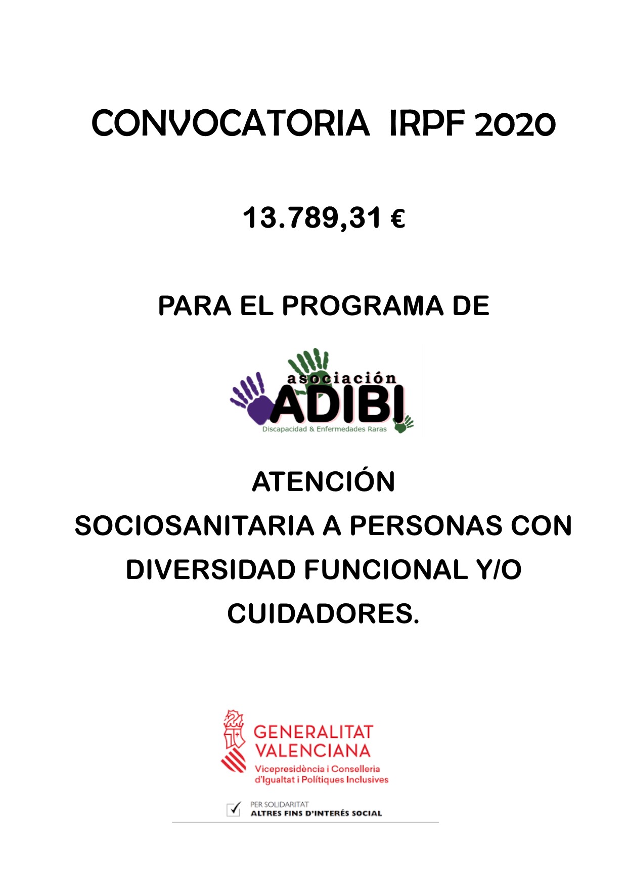 Adibi continúa durante el 2021 con sus Servicios de Atención Sociosanitaria dirigidos a personas con discapacidad y/o familiares con la finalidad de potenciar su autonomía personal, gracias a la financiación de 13.789,31 € aprobados en la Convocatoria de ayudas dirigidas a la realización de programas de interés general para atender a fines de carácter social con cargo autonómico de la asignación autonómico de la asignación tributaria del 0,7 % del Impuesto sobre la Renta de las Personas Físicas (IRPF 2020) y a través de Cocemfe Alicante.