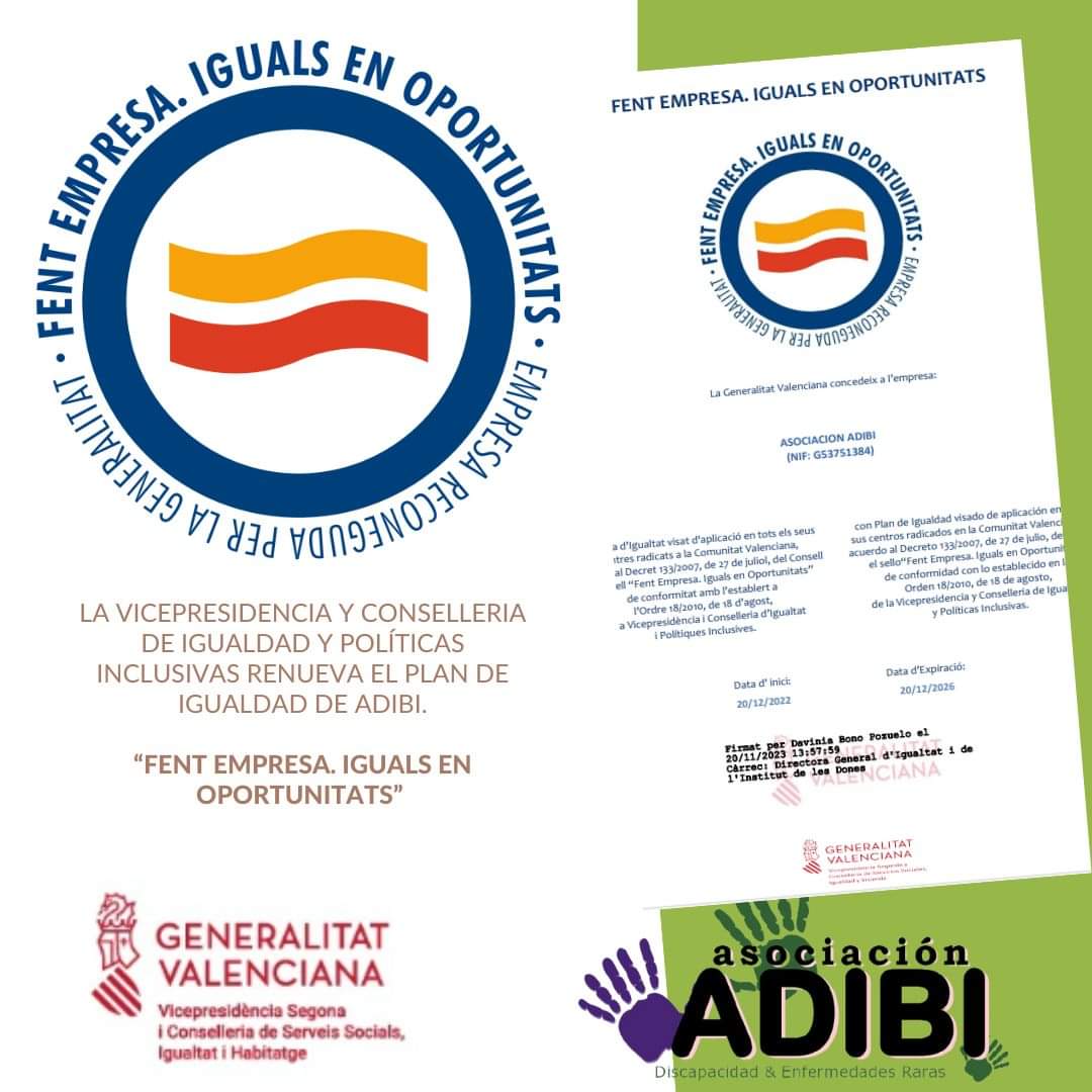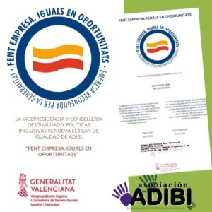 ¡¡Un logro más!! ADIBI según Resolución de la Dirección General de Igualdad por la que se acuerda la VALIDACIÓN, CONCESIÓN DEL VISADO del Plan de Igualdad a la entidad , y CONCESIÓN DEL USO DEL SELLO. “Fent Empresa. Iguals en Oportunitats”.