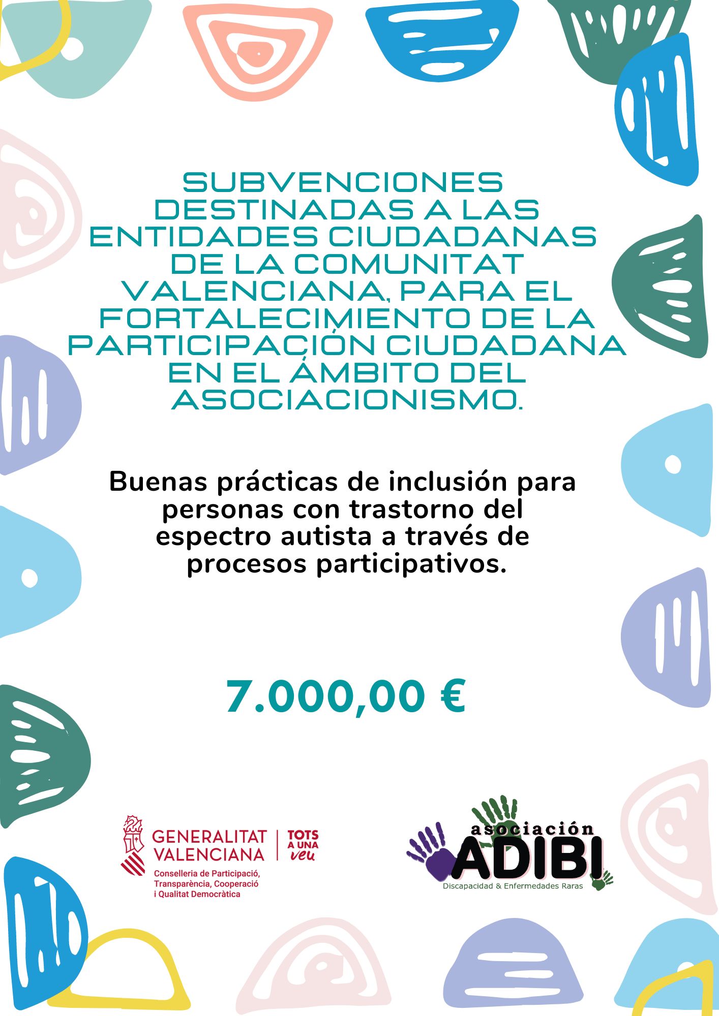 Adibi juntament amb el grup de familiars de persones amb trastorn de l’espectre autista es troba treballant en el projecte de Bones Pràctiques d’Inclusió per a persones amb Trastorn de l’Espectre Autista gràcies a la subvenció amb import de 7.000 € de la Conselleria de Participació, Transparència, Cooperació i Qualitat Democràtica i diferents agents socials a través de processos participatius per a treballar un món més accessible per a tots i totes.