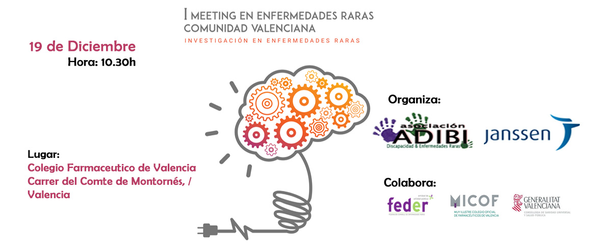 El próximo lunes, 19 de diciembre, se celebrará el I Meeting en Enfermedades Raras Comunidad Valenciana, organizado por la Asociación de ADIBI –Asociación de personas con Discapacidad y Enfermedades Raras- y Janssen y con la colaboración de la Federación Española de Enfermedades Raras (FEDER), la Conselleria de Sanidad universal y salud pública y el Colegio Oficial de Farmacéuticos de Valencia.